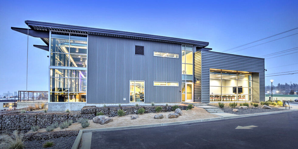 JC Wright Lighting is a corporate office and warehouse facility that provides a modern open studio space that showcases specialty lighting products. Elevated above the vibrant University District, the building features plenty of natural daylight, providing a healthy work environment for employees. The exterior landscape embraces the basalt formations upon which facility is built.