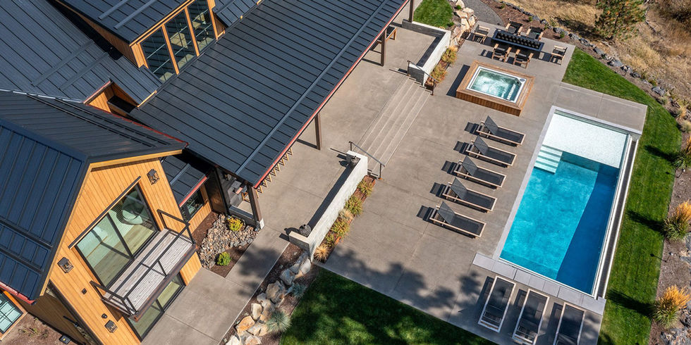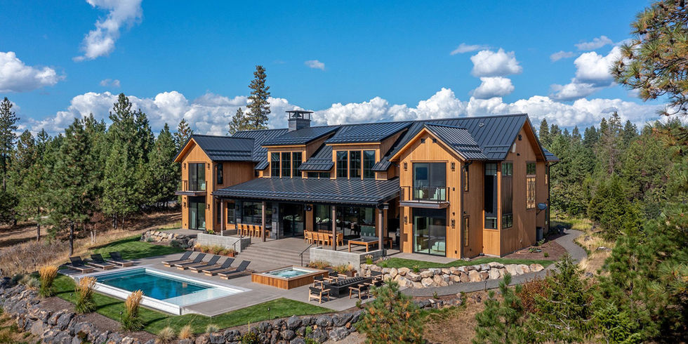 This custom home enjoys amazing golf views from the rear landscape terrace. The project features a multi-level outdoor living and entertainment space. Custom steel planters flank the stair as you proceed to the lower level where family and friends enjoy a swimming pool and hot tub against the beautiful landscape backdrop of North Idaho.